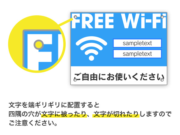 文字を端のギリギリに配置すると、穴が文字に被ったり、文字が切れたりしますのでご注意ください。
