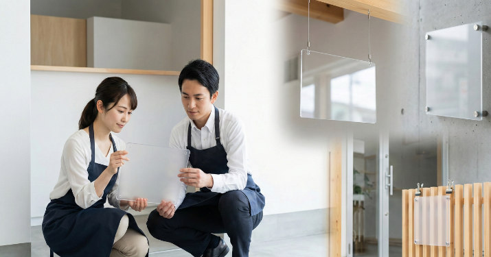 天井、壁面、柵やフェンスなど設置場所別のアクリル看板の取り付け方法や、注意点をご紹介します。